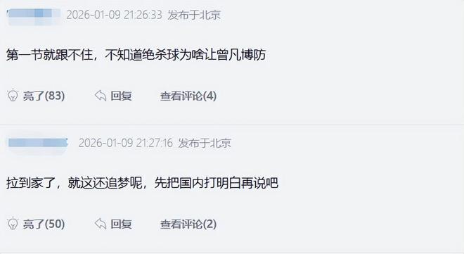 小曾在攻防两端的糟糕表现成了球迷们热议的焦点,有球迷形容小曾本场比赛的表现:没有任何一点防守,没有对抗,没有力量,没有横移,没有阅读。还有球迷直接嘲讽:拉到家了,就这还追梦呢,先把国内打明白再说吧。