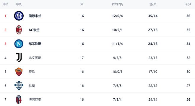 在积分榜上,国际米兰以36分排名榜首。第2名的是AC米兰,拿到35分,只落后1个积分。第3名的是那不勒斯,拿到34分,紧随其后。尤文图斯以32分排名第4。前4最多只差4分,榜首之争非常乱,每轮比赛过后都有可能导致榜首发生变化。罗马以30分排名第5,在争冠集团中有点掉队。科莫以27分排第6。第7的是博洛尼亚,拿到26分。拉齐奥以24分排名第8。